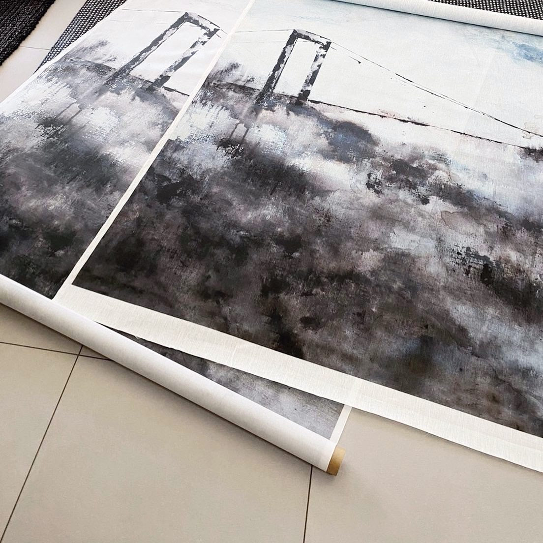 Digitalt tryck av motivet 'Älvsborgsbron' på Linne. Textiltrycket trycks i Borås i en liten upplaga åt gången.